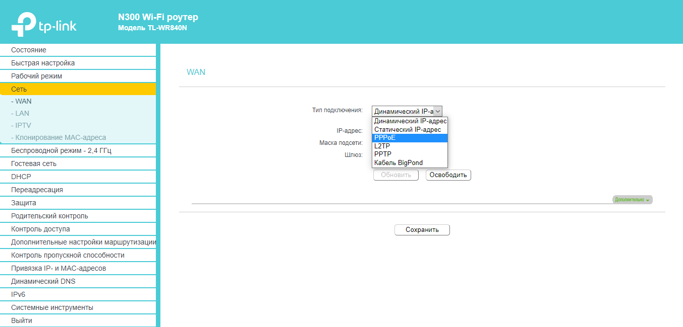 - В меню выбрать «Сеть» (Network), а после категорию WAN Connection type: L2TP или PPTP.