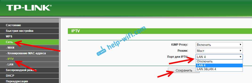 Проверьте включен ли «IGMP Proxy», выберите режим «Мост» и выберите номер LAN порта, который (или которые) будут отведены под IPTV. В этот порт нужно подключить приставку.