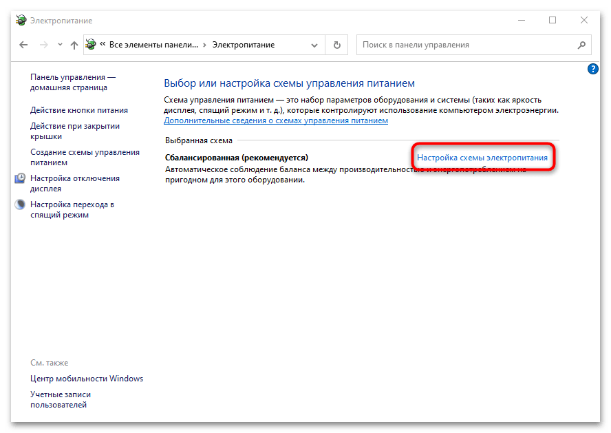 Щелкните по строке «Настройка схемы электропитания» в главном окне.
