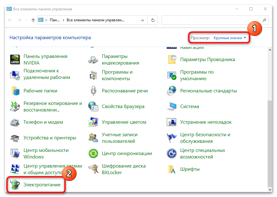 Если отображение разделов установлено по категориям, то для более удобного поиска нужного лучше выбрать «Мелкие значки» или «Крупные значки». Перейдите в раздел «Электропитание».