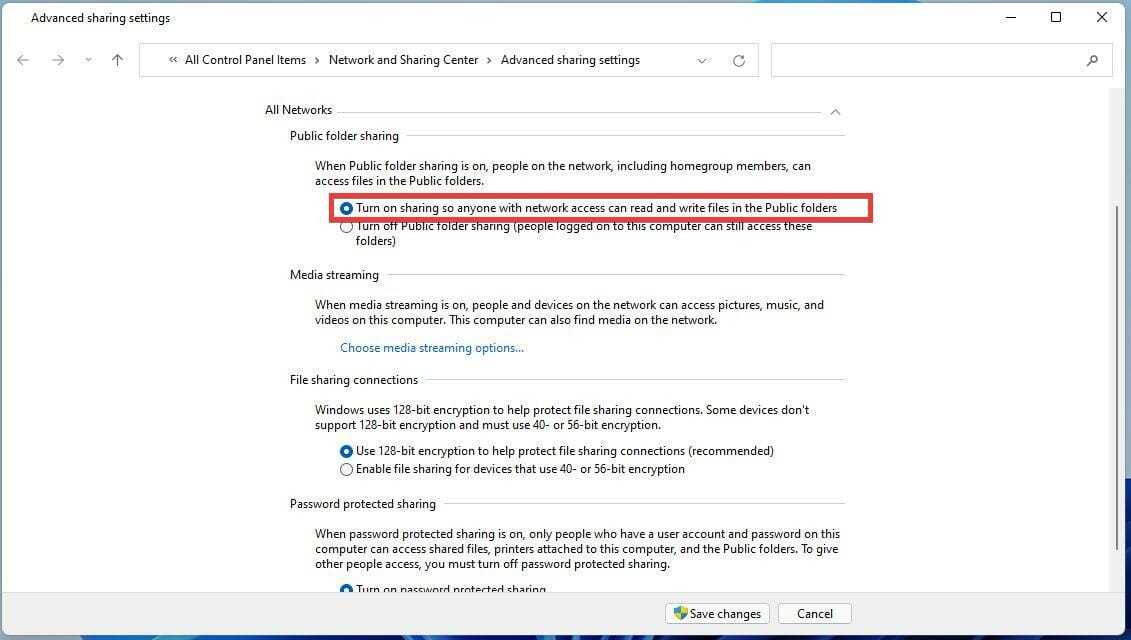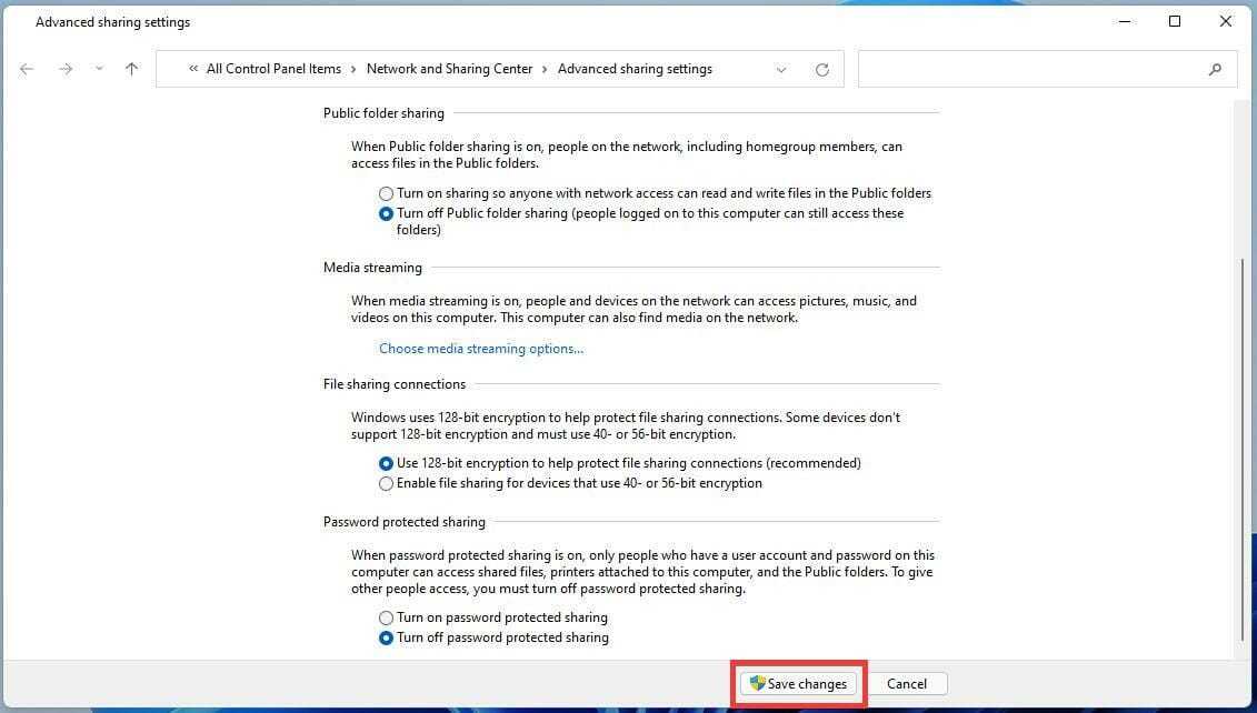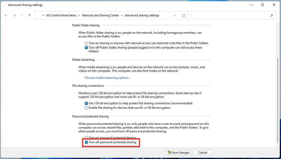 3. Отключите параметр совместного доступа, защищенного паролем.