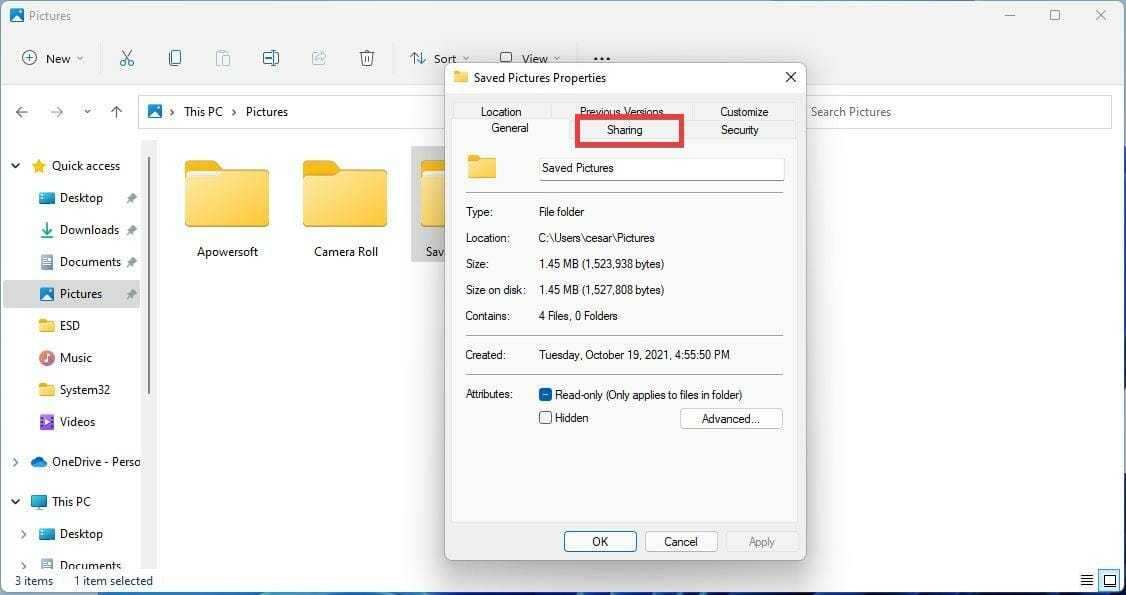 В новом окне «Свойства» выберите вкладку « Совместное использование ».