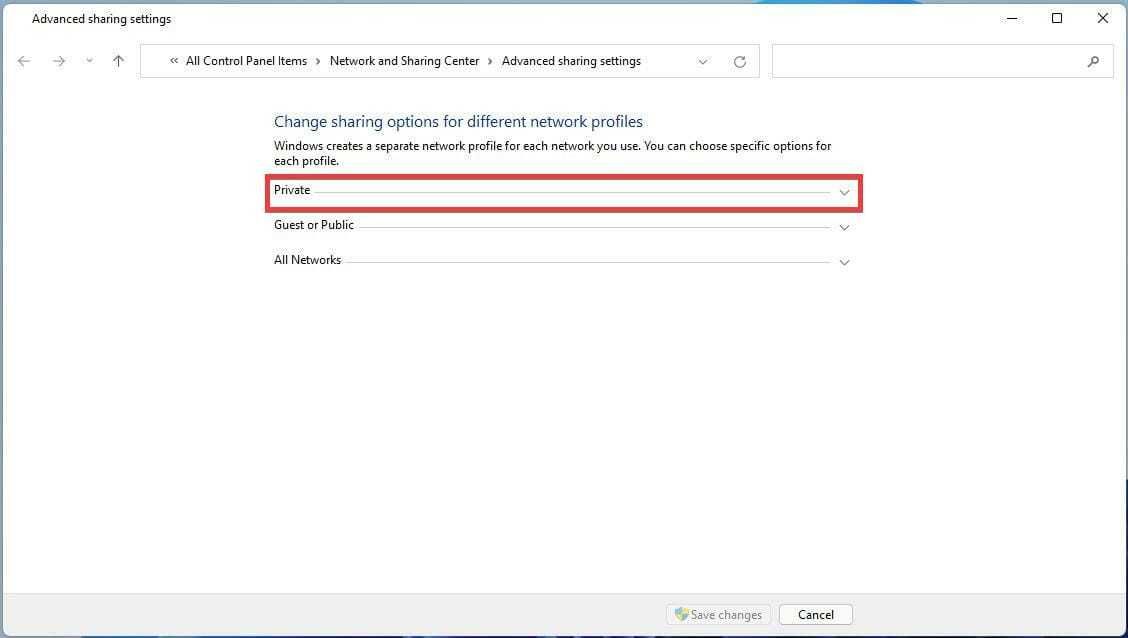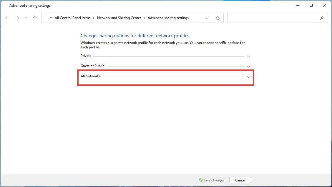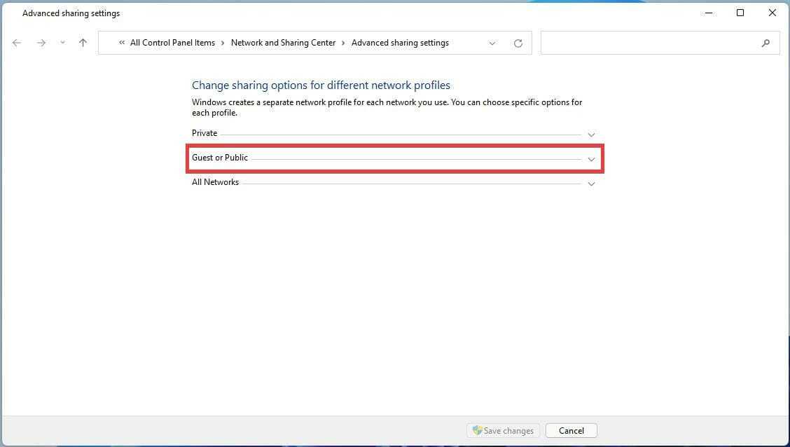 В строке поиска введите Расширенные настройки общего доступа и выберите первую запись, которую вы видите.