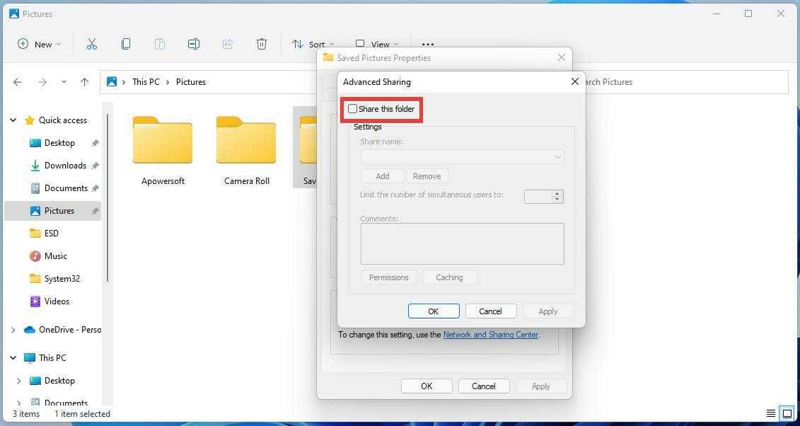 Установите флажок в верхней части окна, чтобы разрешить общий доступ к этой папке.