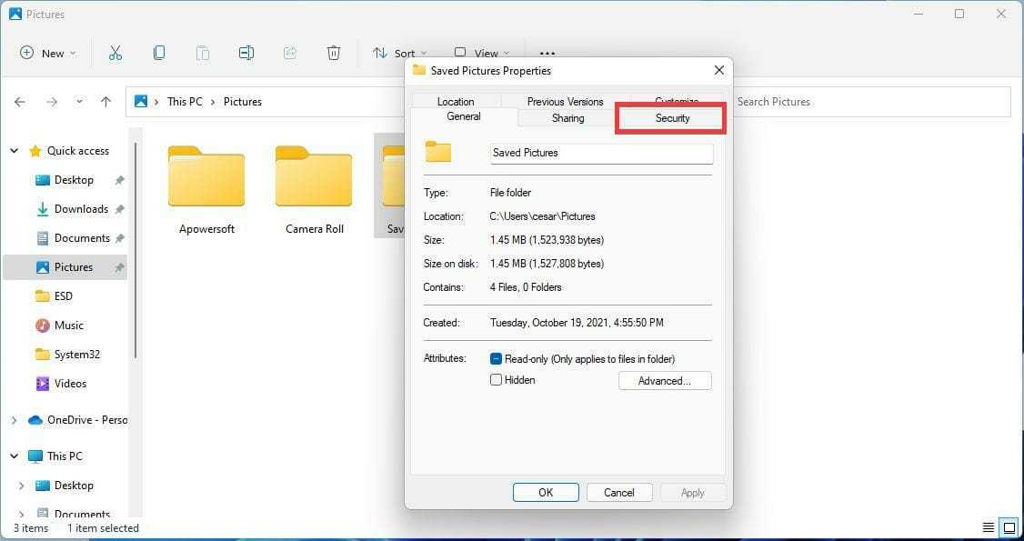Выберите вкладку « Безопасность » в окне «Свойства».