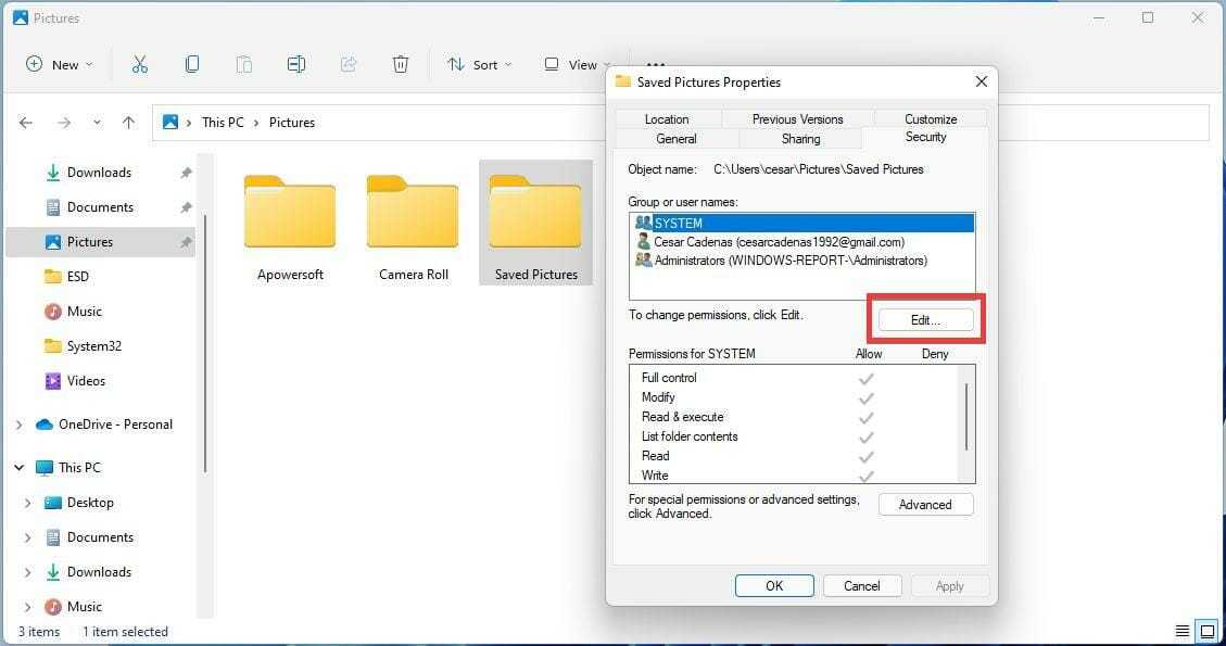 Нажмите « Изменить» посередине, чтобы изменить разрешения.