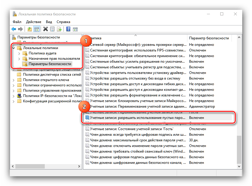 Раскройте последовательно директории «Локальные политики» и «Параметры безопасности», затем найдите в правой части окна запись с именем «Учётные записи: разрешить использование пустых паролей» и сделайте по ней двойной щелчок мышью.