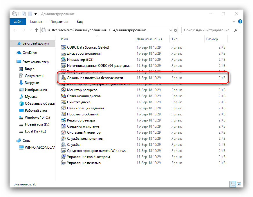 Откроется каталог, где следует найти и запустить приложение «Локальная политика безопасности».