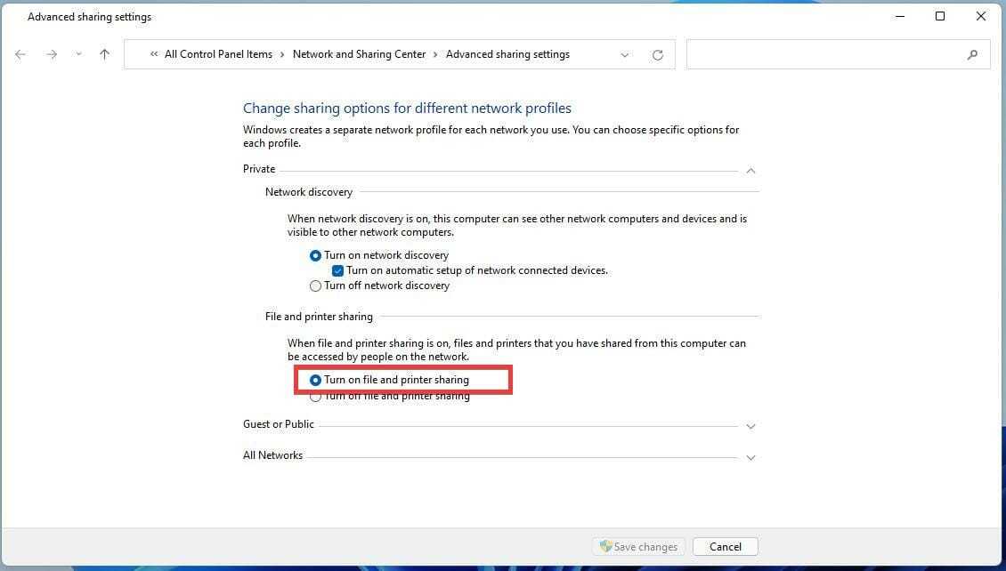 Затем выберите Включить общий доступ к файлам и принтерам, если он еще не выбран.