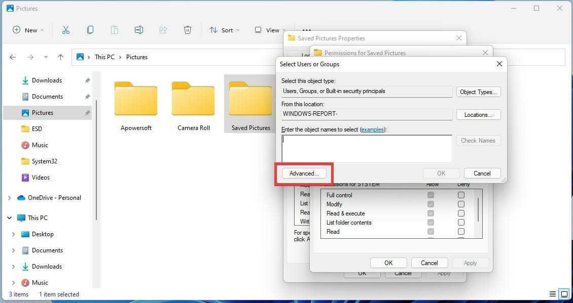 В новом всплывающем окне Выбор пользователей или групп, выберите Дополнительно в нижней части.