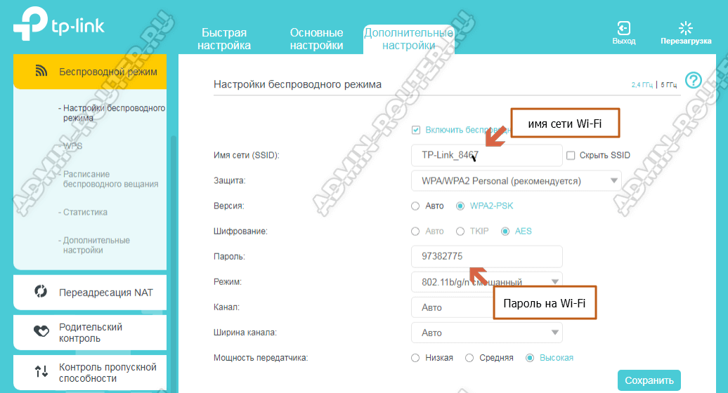 В заводском варианте настройки уже установлены оптимальные параметры сети Wi-FI на TP-Link Archer C5: задано индивидуальное имя сети, установлен уникальный и достаточно сложный пароль. При необходимости всегда можно изменить эти настройки WI-FI через раздел «Дополнительные настройки» ⇒ «Беспроводной режим». Там для каждого из диапазонов надо выбрать затем выберите пункт меню «Настройки беспроводного режима».