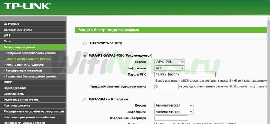 Для обеспечения безопасности беспроводной сети необходимо выбрать соответствующий протокол шифрования. В разделе «Wireless Security» выберите тип шифрования, например, WPA2. В поле «Security Password» введите пароль для шифрования данных, соответствующий выбранному типу шифрования.