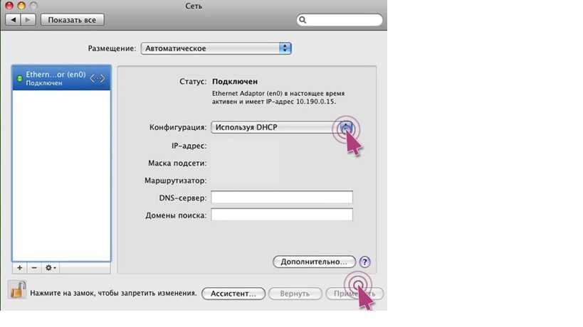 Нажмите Apple -> Системные настройки -> Сеть -> Выберите Ethernet -> Конфигурация IPv4: Используя DHCP.