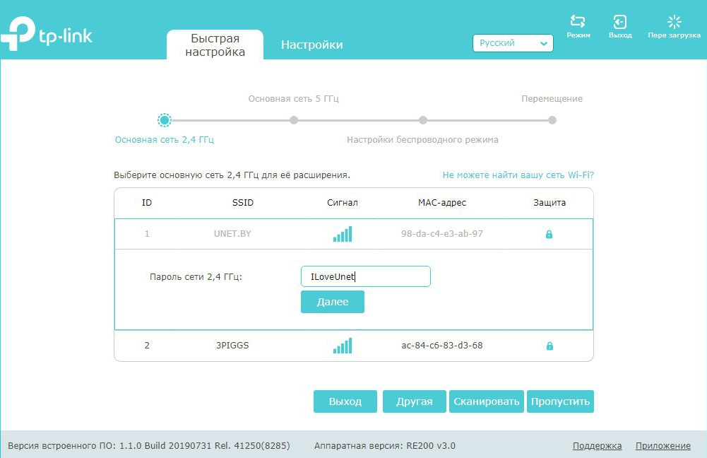 Далее открывается окно быстрой настройки, где нам нужно будет пошагово указать, к каким сетям и с какими паролями будет подключаться усилитель.