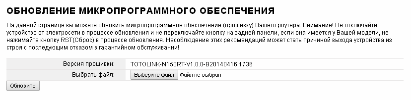 Как правило, роутеры поставляются от дилеров с устаревшими прошивками, т.к. программное обеспечение постоянно совершенствуется и с момента отгрузки роутеров производителем до установки их у пользователя может быть выпущен ряд свежих прошивок. Поэтому, первым делом необходимо произвести обновление прошивки. Но, в данном случае это не получится, т.к. на момент составления данного описания по роутеру, на сайте производителя Totolink доступна единственная русскоязычная версия прошивки, она же и установлена в роутере. Чтобы в этом убедиться: