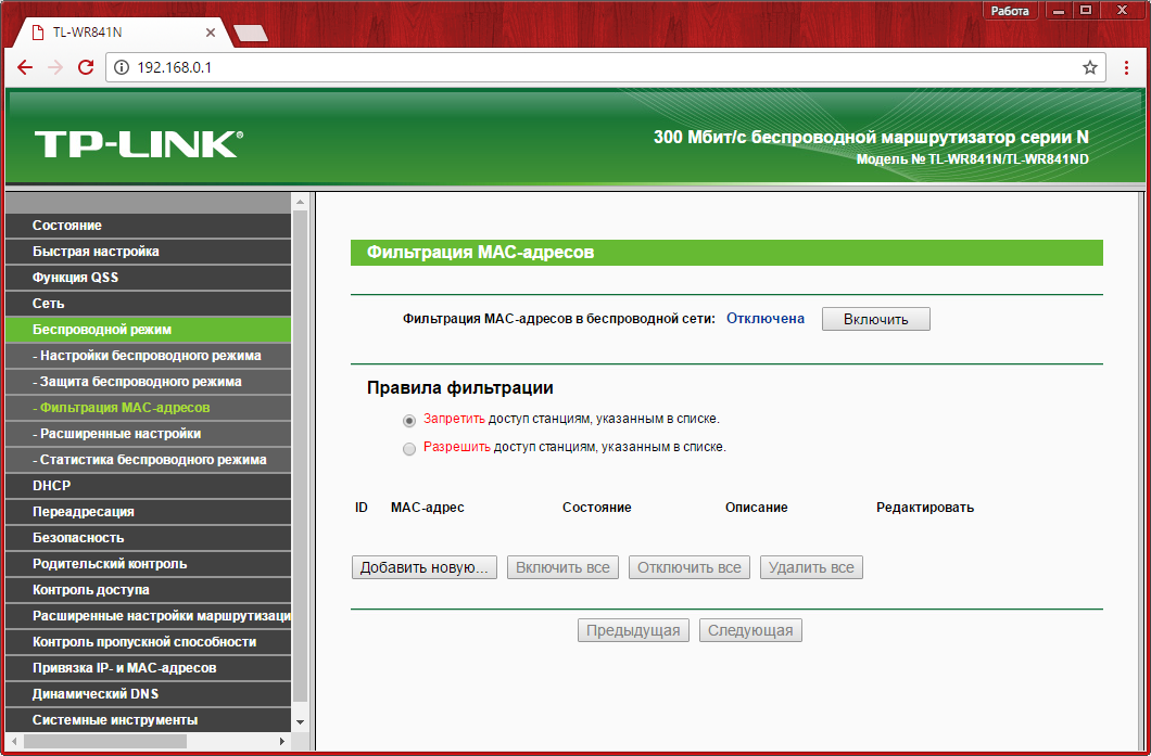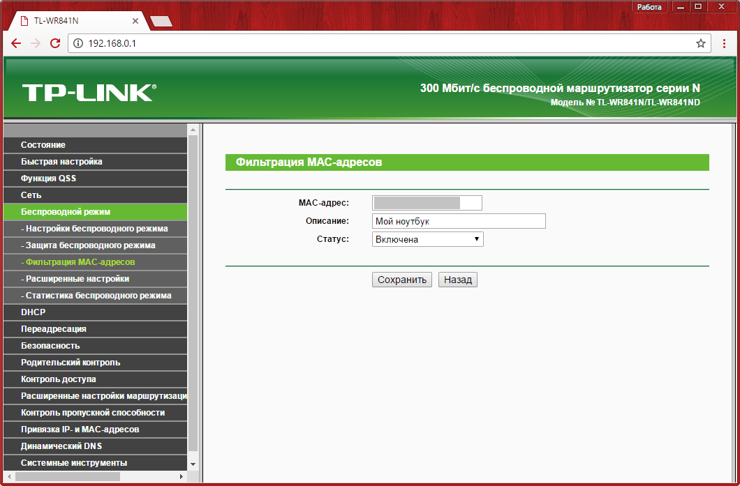 При выборе первого варианта вы сможете запретить подключение отдельных устройств к WiFi сети, раздаваемой данным маршрутизатором TP-Link. Для этого в поле «MAC-адрес» необходимо ввести комбинацию, которую можно уточнить на следующем шаге. В поле «описание» написать понятное вам название девайса, а статус изменить на «Включена».