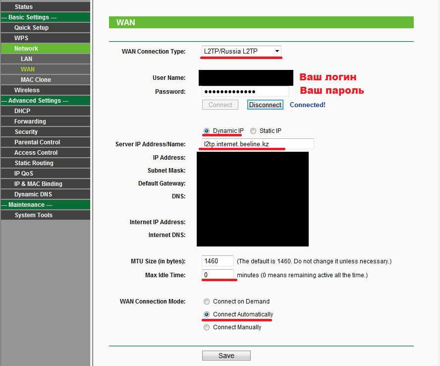 Главное чего нужно добиться в это окне чтобы у вас все заработало, если все получилось жмем сохранить. Если возникли затруднения на данном этапе звоните своему интернет — провайдеру и узнайте все детали для настройки маршрутизатора.