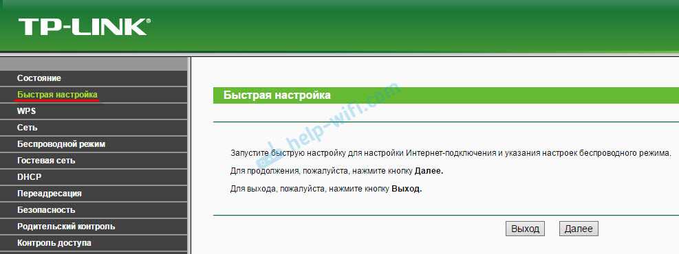 Подключение и настройка интернета происходит в разделе Quick Setup (быстрая настройка роутера TP-Link) бокового меню слева. В других моделях этот раздел может называться WAN Settings / WAN Configurations (настройки WAN).