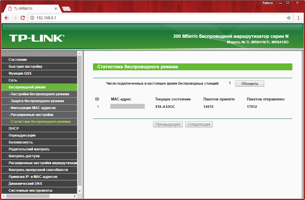 Уточнить MAC-адреса подключенных устройств можно в меню «Беспроводной режим -> Статистика беспроводного режима». В нём присутствуют только устройства, подключение которых осуществляется по WiFi. Здесь же отображается статистика работы на различных компьютерах и гаджетах (количество принятых и отправленных пакетов). Кроме получения адресов ваших устройств, это меню можно использовать для контроля несанкционированных подключений. Например, если скорость WiFi на вашем роутере WR841N упала и вы подозреваете, что кто-то посторонний подключился к вашей сети, проверить это можно в данном меню.