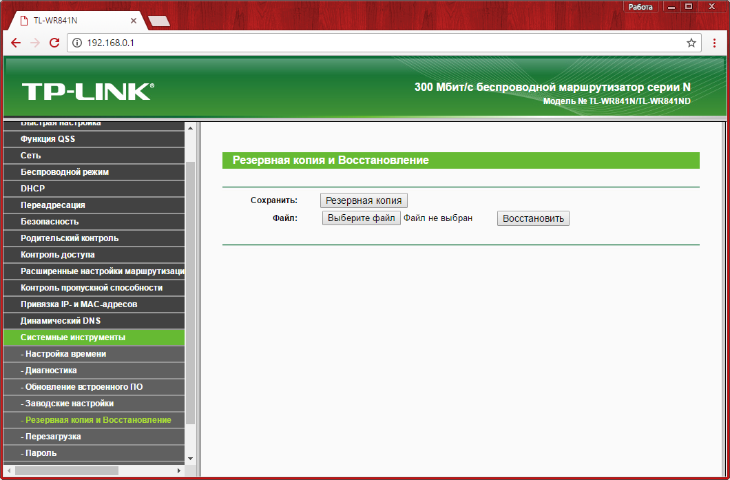 После того, как настройка вашего роутера TP-Link WR841N выполнена, рекомендуется сохранить параметры в отдельном файле. Вы сможете сделать это на вкладке «Системные инструменты -> Резервная копия и восстановление». Параметры конфигурации будут сохранены в формате bin, и через это же меню вы сможете восстановить их. Такая необходимость возникнет в том случае, если в дальнейшем вами будут внесены некорректные изменения в настройки или они будут случайно сброшены с помощью кнопки «Reset» на задней панели.