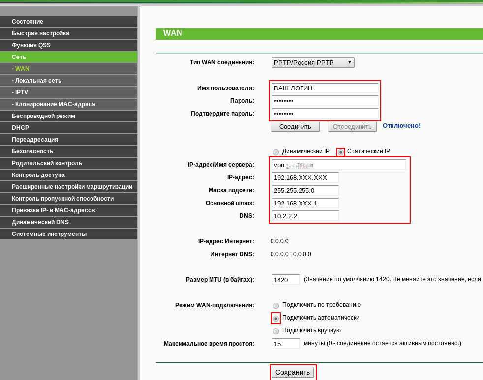 В этом разделе всё сводится к вбиванию 2-5 параметрах подключения, которые предоставляются провайдером. В нашем примере это: