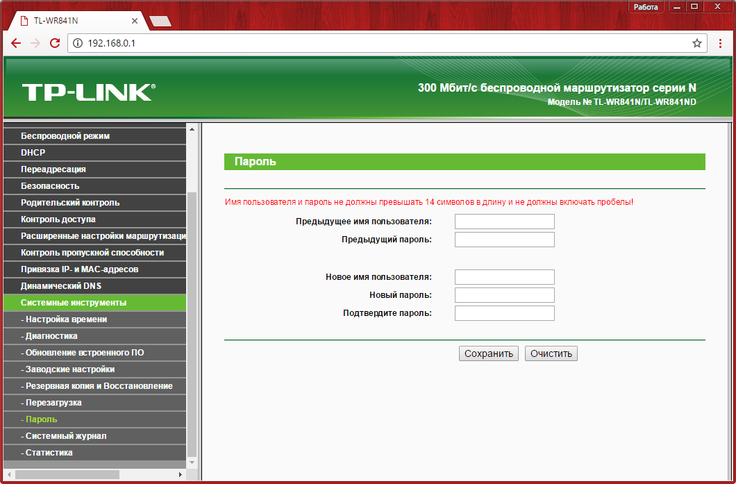 Последним шагом при настройке WR841N является изменение имени пользователя и пароля в разделе «Системные инструменты -> Пароль». При этом система запросит текущие данные учётной записи. Изменения вступят в силу после того, как роутер TP-Link будет перезагружен.