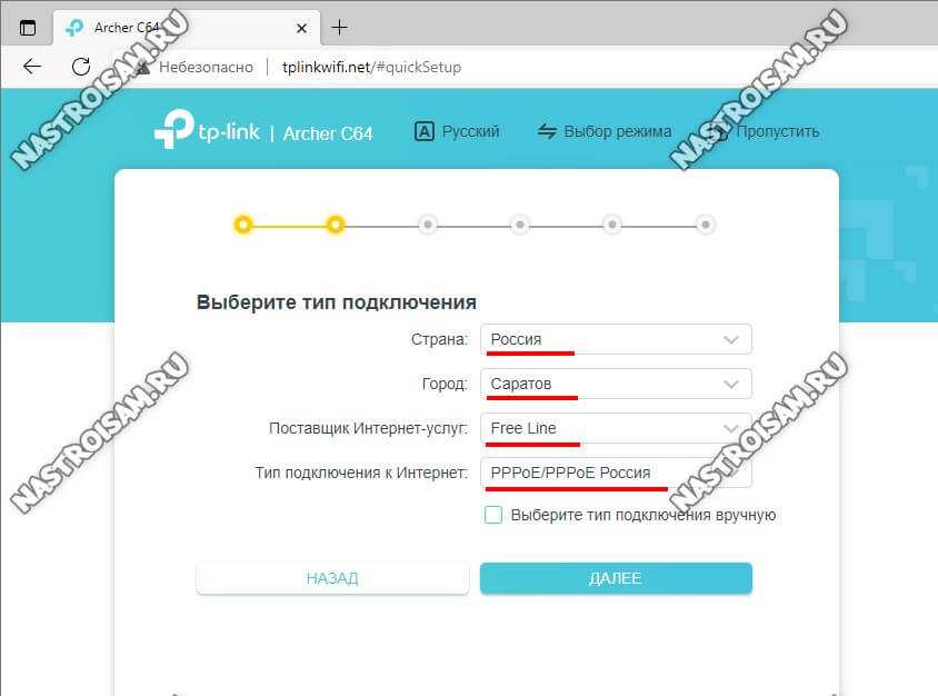 Третий шаг — настройка подключения роутера к Интернету. Вы можете выбрать свой город, провайдера и тип подключения: