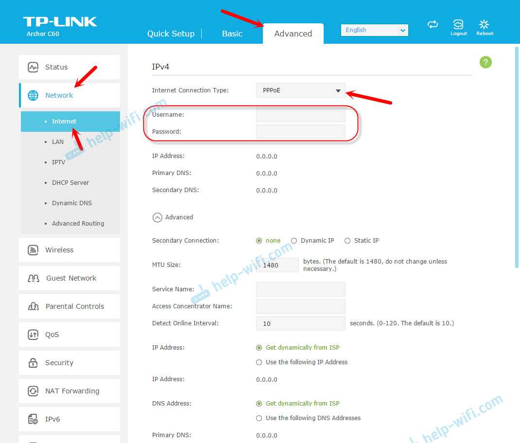 Если же интернет через роутер не работает (без доступа к интернету, или ограничено) , то нужно задать параметры для подключения к провайдеру. Для этого перейдите на вкладку «Advanced» – «Network» – «Internet».