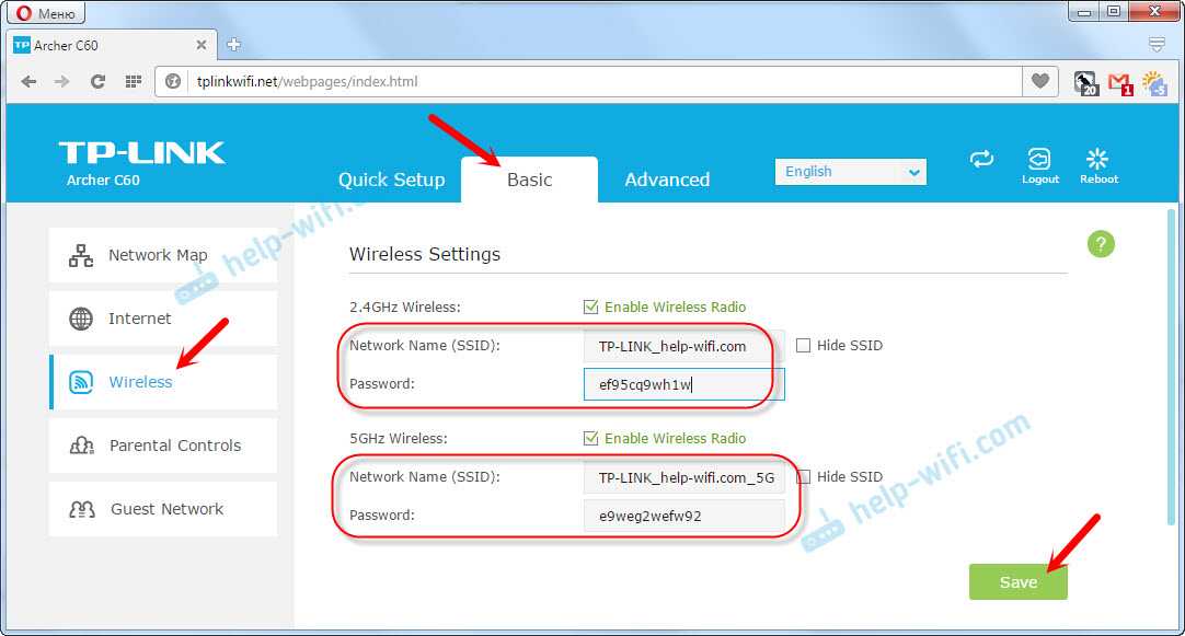 Там вы увидите настройки двух сетей: 2.4GHz Wireless и 5GHz Wireless. Меняем название (SSID) и пароль для каждого диапазона. Пароль должен быть минимум из 8 символов. Английскими буквами.