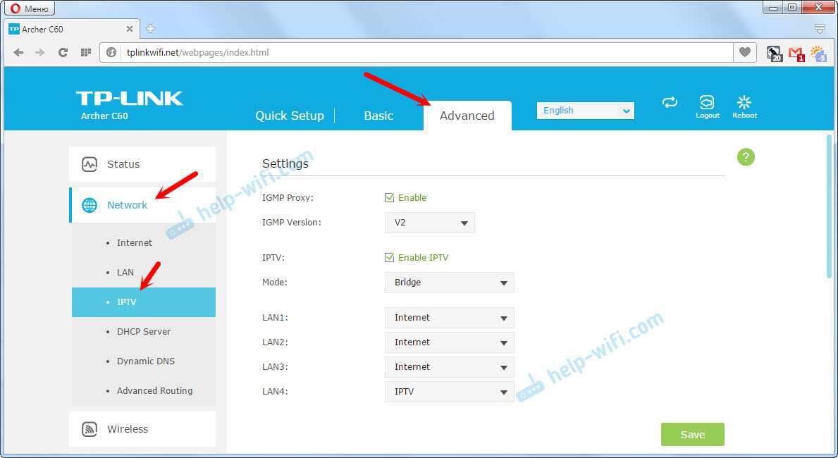 Настройка IPTV телевидения на роутере TP-Link Archer C2, C5, C7, C20, C50, C1200 с VLAN ID выполняется следующим образом: