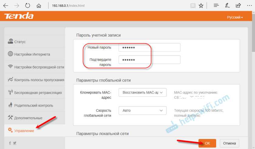 Web-интерфейс – это страница с настройками маршрутизатора. И чтобы каждый, кто подключен к вашему маршрутизатору не смог получить к ней доступ, рекомендую защитить ее паролем. Установить его можно в разделе «Управление». Просто укажите новый пароль и нажмите Ok. Запишите пароль, чтобы не забыть. Если забудете его, то нужно будет сбрасывать настройки роутера.