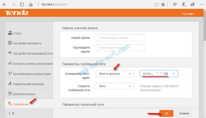 Если же вы хотите клонировать MAC, то перейдите в раздел «Управление». В меню «Клонировать MAC-адрес» выберите ввести вручную, и введите MAC компьютера, к которому привязан интернет.