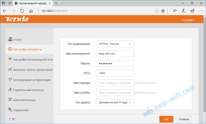 Tenda F300 выйдет в Сеть, используя протокол PPPoE.