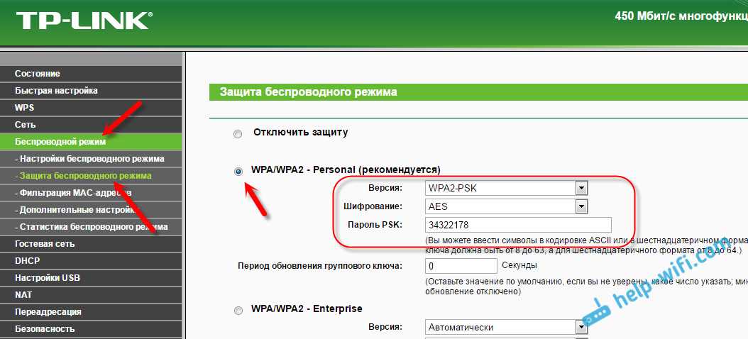 Перейдите на вкладку «Защита беспроводного режима» (Wireless Security). Выделите пункт «WPA/WPA2 — Personal (рекомендуется)», выставьте параметры версии и шифрования, как на скриншоте ниже, и в поле «Пароль PSK» придумайте и запишите пароль, который будет использоваться для защиты вашей Wi-Fi сети. Пароль должен быть минимум 8 символов.