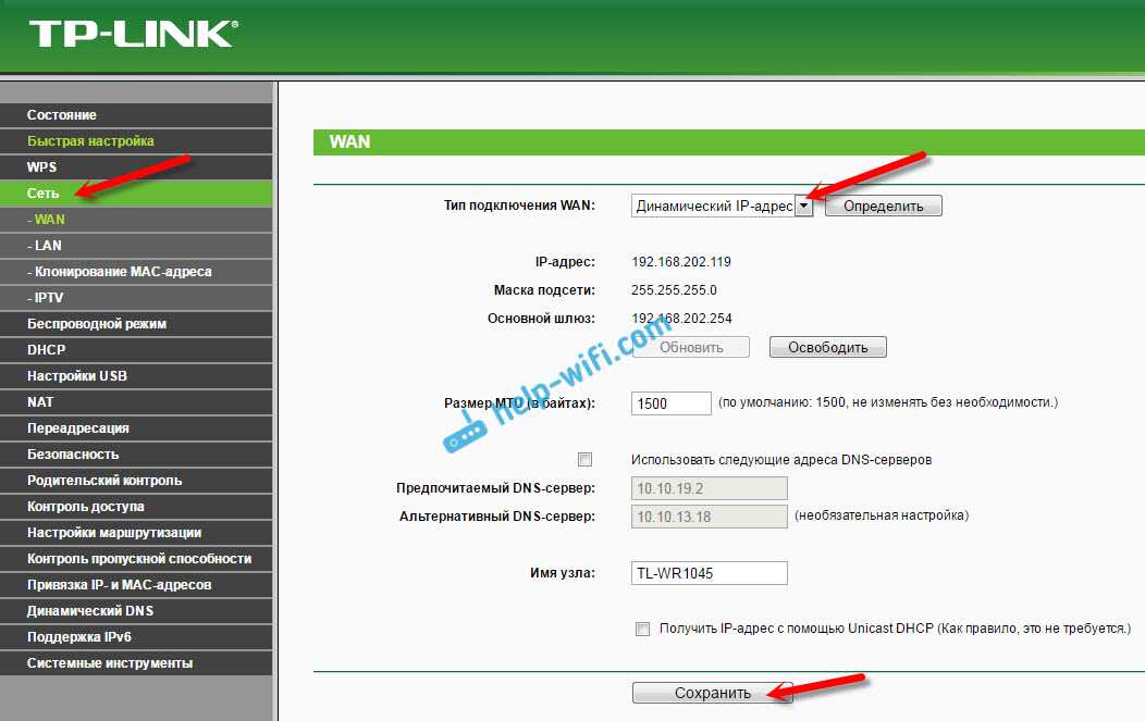 На странице «WAN» устанавливаем тип подключения — динамический IP-адрес, то есть включаем автоматическое определение сетевых координат. Нажимаем на кнопку «Сохранить».