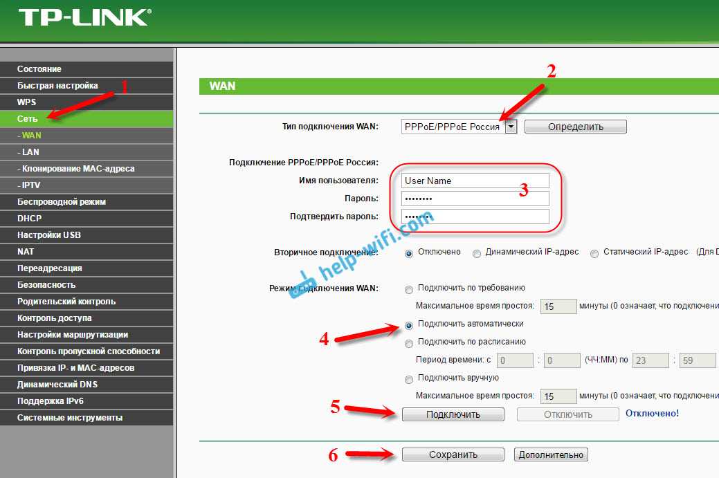 Выбираем тип подключения PPPoE, задаем имя пользователя и пароль (которые выдает провайдер) , затем проверяем, выставлено ли автоматическое подключение, нажимаем на кнопку «Подключить», и если соединение с провайдером будет установлено, сохраняем настройки.