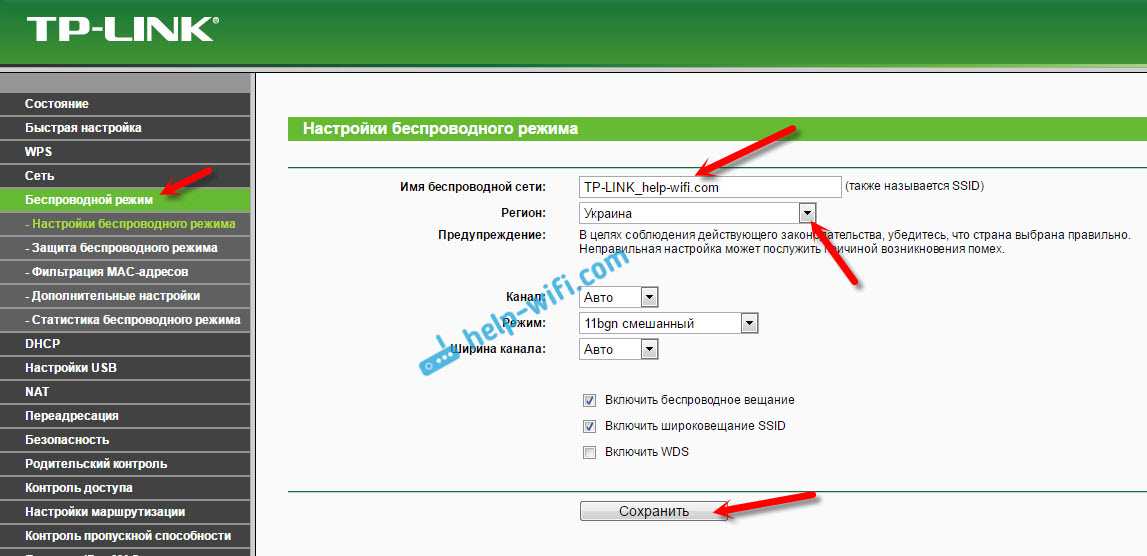 Перейдите на вкладку «Беспроводной режим» (Wireless). Здесь нужно сменить название Wi-Fi сети (SSID), и указать регион. Для сохранения настроек нажимаем на кнопку «Сохранить» (Save).