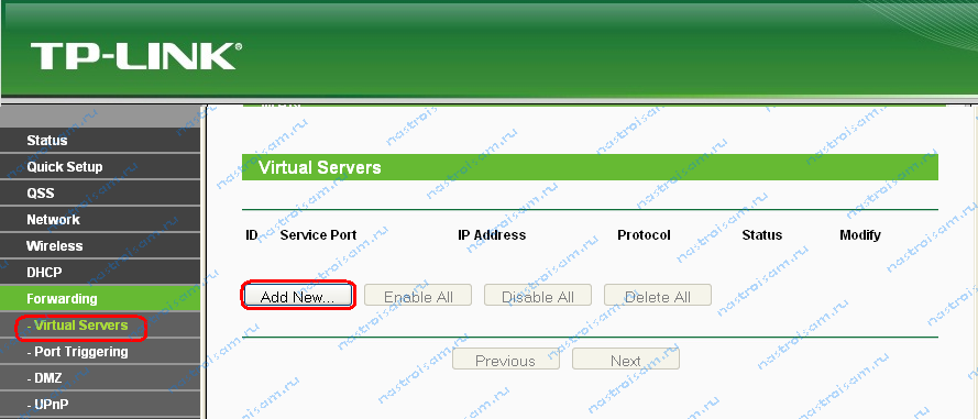Данная функция автоматически перенаправляет запросы определенных сервисов из Интернета на соответствующий хост Вашей локальной сети, находящийся за межсетевым экраном роутера. Использовать данную функцию следует в том случае, если Вы хотите создать в локальной сети за межсетевым экраном роутера какой-либо сервер (например, Web-сервер или почтовый сервер). Заходим в Переадресация (Forwarding), нажимаем Добавить (Add New).