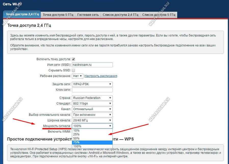 На некоторых роутерах мощность задаётся в процентах, а на некоторых есть просто фиксированные значения «слабый», «средний» и «сильный».