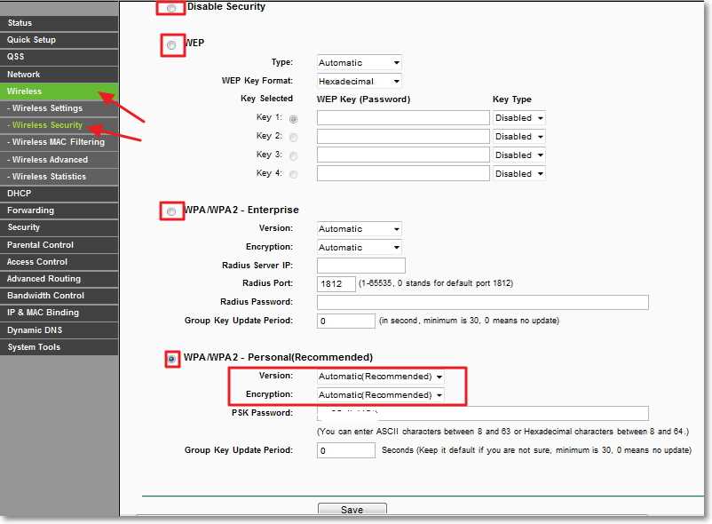 Ещё один способ, который нередко помогает в случае с планшетами и смартфонами на базе операционной системы Android — смена типа шифрования. У большинства роутеров по умолчанию при выборе стандарта безопасности WPA2-PSK автоматически ставится тип шифрования — AES. И это правильно. Но только вот до сих пор встречаются старые версии Андроида, которые с AES не работают. Поэтому его можно попробовать сменить на TKIP. Делается это так же, в параметрах безопасности: