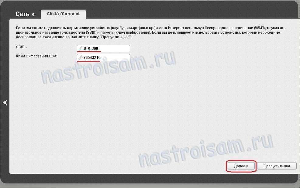 В поле «SSID» нужно ввести имя создаваемой беспроводной сети Wi-Fi а в поле «Ключ шифрования PSK» — пароль на вашу сеть Wi-Fi. В качестве ключа сети можно использовать любую буквенную, цифирную или смешанную последовательность не короче 8 символов. Нажимаем «Далее».