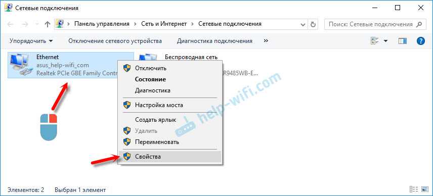 Если подключение по Wi-Fi, то нажимаем правой кнопкой мыши на «Беспроводная сеть» (Беспроводное сетевое соединение). Если же подключение по кабелю, то нажимаем на «Ethernet» (Подключение по локальной сети). Выбираем «Свойства».
