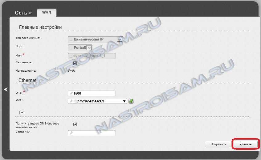 Если у Вас используется тип подключения — Dynamic IP, как в ТТК-Урал или Ростелеком в Удмуртии — ничего не трогайте — роутер с завода настроен именно под такой тип подключения. Если же у Вас используется PPPoE, PPTP или L2TP — нажимаем кнопку «Удалить».
