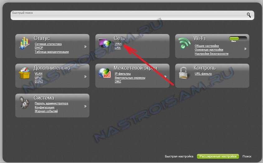 Первым делом надо разобраться с существующими настройками интернет-подключения. Выбираем раздел «Сеть» > «WAN»: