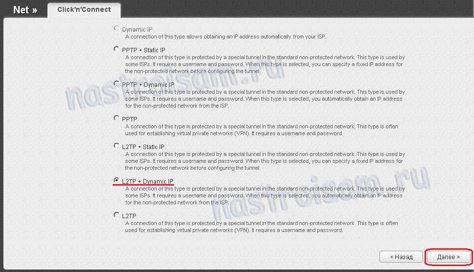 В случае Билайн — выбираем «L2TP+Dynamic IP»: