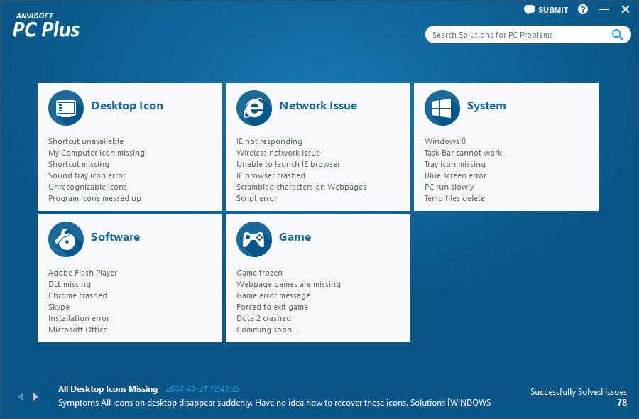 Работать с программой достаточно просто: в главном окне вы выбираете область, проблему в которой нужно решить (например, проблемы с доступом к сети Интернет). Далее находите нужную вам ошибку и выбираете «Исправить» («Fix»). Anvisoft PC PLUS автоматически исправит обнаруженные неполадки.