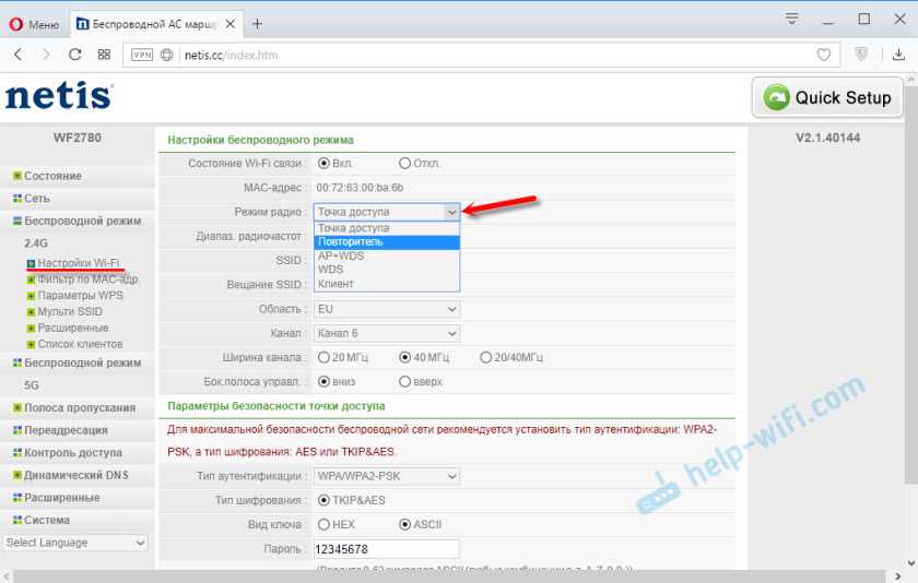 Кстати, Netis WF2780 может работать в разных режимах: точка доступа, повторитель, AP+WDS, WDS, Клиент (приемник) . Как настроить этот роутер в режиме повторителя я уже писал: роутер Netis как репитер, повторитель Wi-Fi сети.
