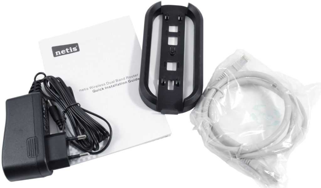 Купив Netis WF2780, вы обнаружите, что в комплекте с ним идет инструкция по применению, сетевой кабель для подключения маршрутизатора по LAN-порту и адаптер для питания устройства. В общем, довольно стандартный набор. Плюс, в наборе вы также сможете найти специальную подставку, на которую можно установить маршрутизатор в вертикальном положении, например, на столе. Впрочем, если вы хорошенько осмотрите Netis WF2780, то найдете на его корпусе отверстия для крепления на стене.