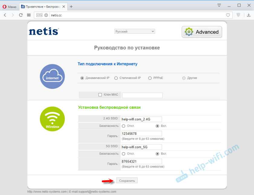 Настройка Netis WF2880 осуществляется через привычный веб-интерфейс, доступный по IP-адресу маршрутизатора или netis.cc. Чтобы не пугать обилием настроек обычных пользователей, на первой странице собраны только самые необходимые параметры: выбор типа подключения к сети провайдера, параметры беспроводных сетей и язык. Для доступа к полному списку настроек нужно нажать «Advanced».