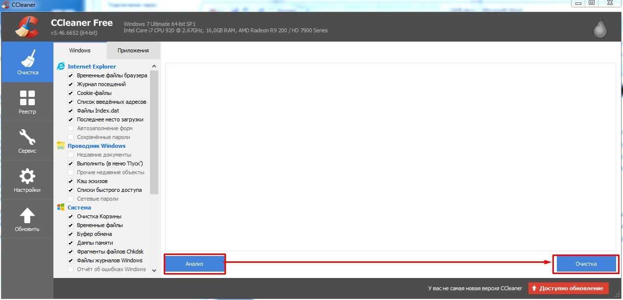 После этого скачайте программу CCleaner и запустите её. В первой вкладке «Очистка» нажмите «Анализ», далее в конце кнопку «Очистка». После этого зайдите в раздел «Реестр» и нажмите «Поиск проблем». Далее, выбираем кнопку исправления ошибок.